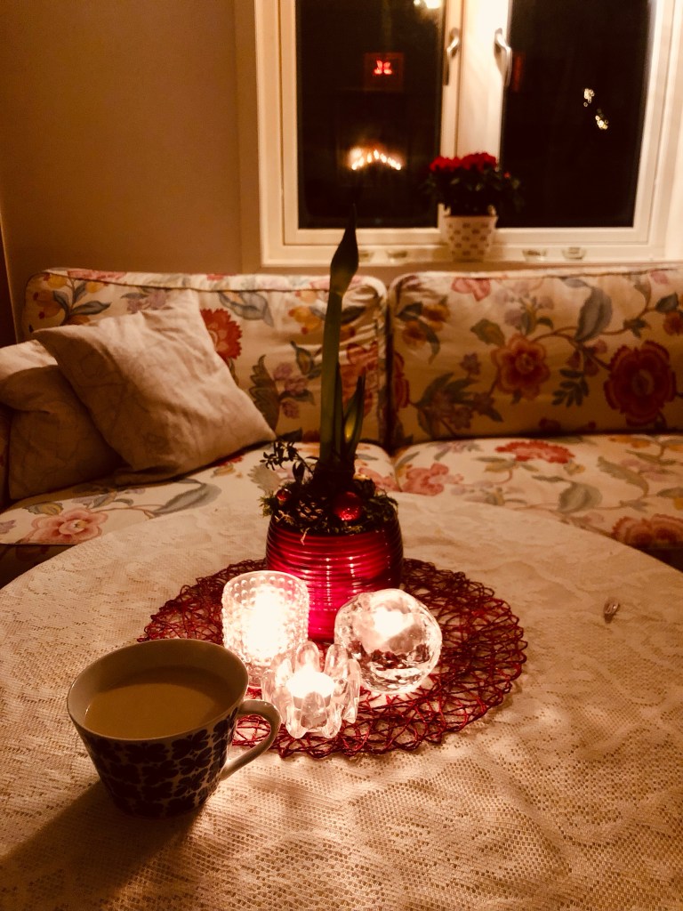 Måndag morgon. En halvtimme kvar innan jag ska väcka barnen. Te i koppen och adventspyntat hem.