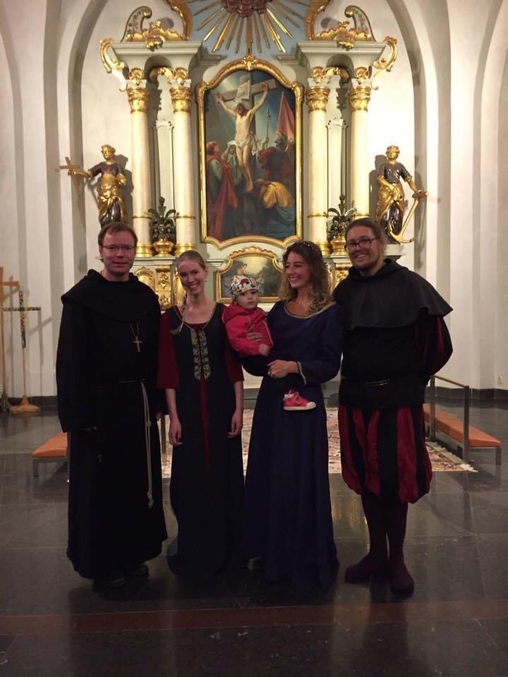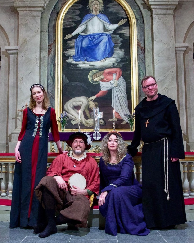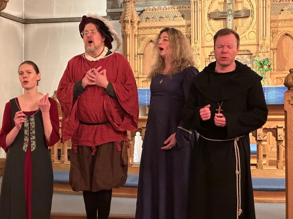 I slutet av januari föll allt på plats. Vi hade först lett en workshop för Stylus Phantasticus och sedan gjort en gemensam konsert med dem. Varsin egen del och några gemensamma. Efter mycket diskussioner bestämde vi oss för scenkläder och bara utantill på vår egen del. Mer och mer agerande växte fram när vi repade och till slut balanserade vi på en skör tråd. Blir det tramsigt nu eller blir det bra? Äh, vi kör!