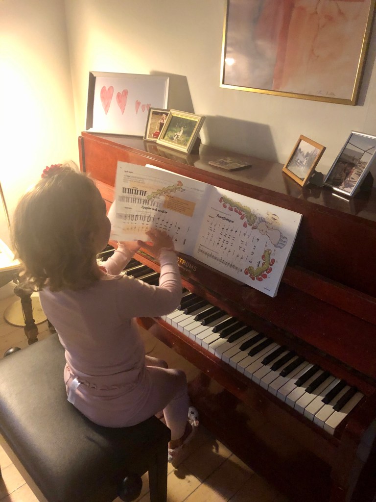 Hon har spelat piano i några månader nu. På en slingrig väg kantad med guldstjärnor har hon långsamt fått grepp om tonernas namn, skillnaden mellan en halvnot och en fjärdedelsnot och var tonerna ligger på notraderna. Jag försöker hålla isär rollerna, försöker bara vara pianofröken och inte mamma, men blir ändå oproportionerligt stolt när hon börjar knäcka notkoden och spelar rätt melodi från bladet.
